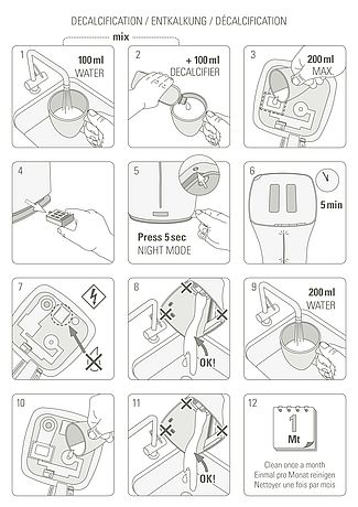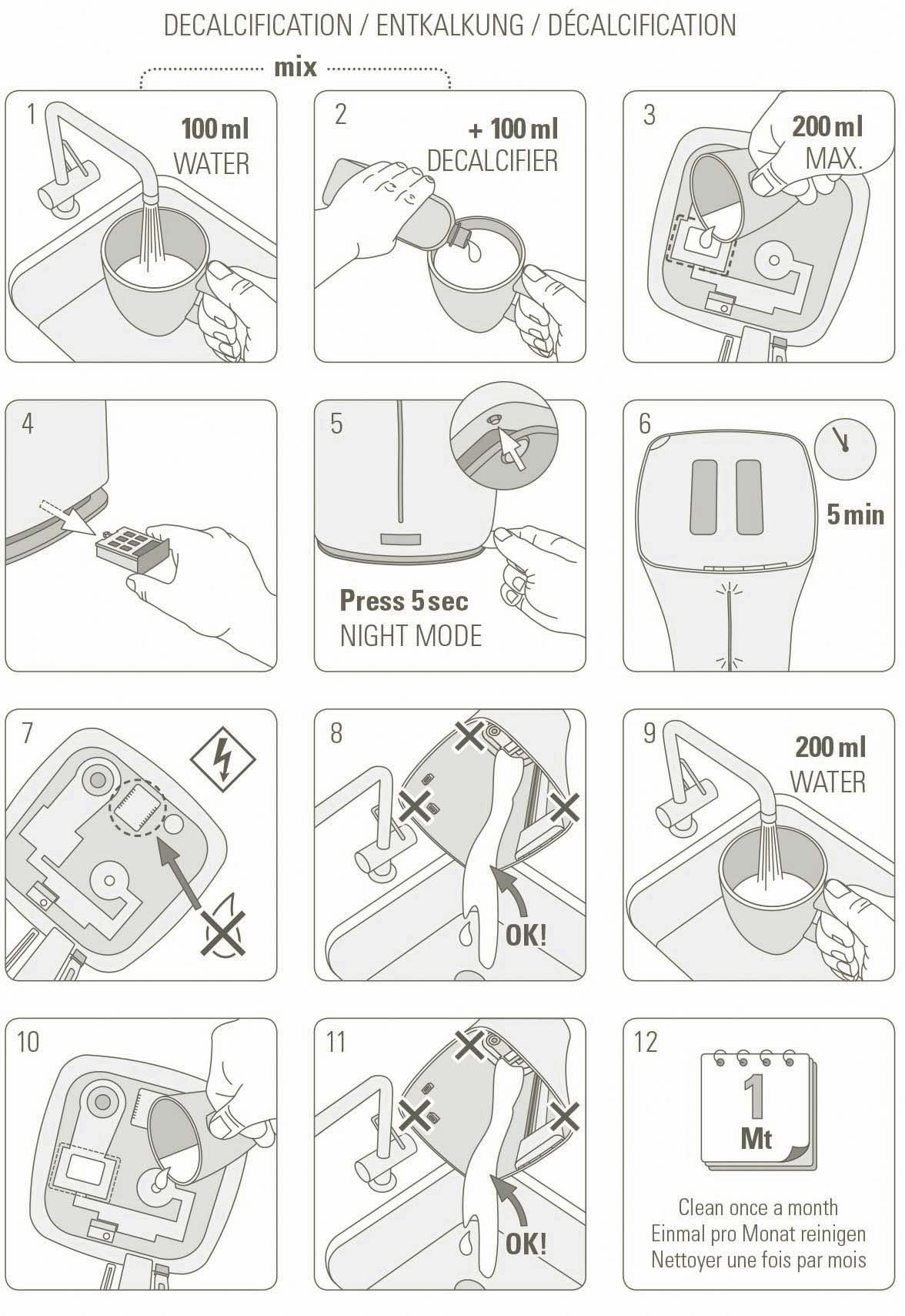 Als de luchtbevochtiger Eva na een aantal weken gebruik minder nevel produceert, moet het waterreservoir worden ontkalkt. Je kan onze schoonmaak instructies hier vinden.