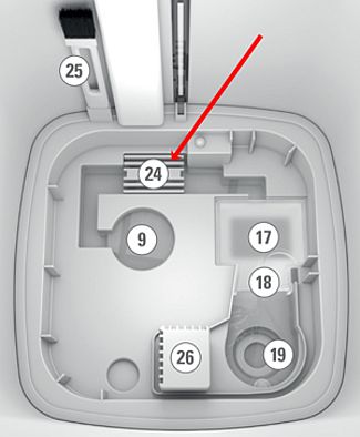De foto laat de positie van de Zilveren Kubus (No. 24) zien in het waterreservoir van Eva. Verwijder de watertank van het apparaat en plaats dan de Zilveren Kubus in de aangewezen positie.